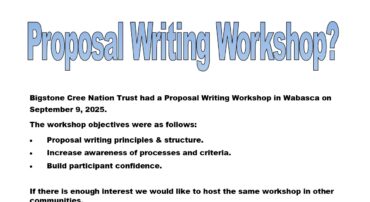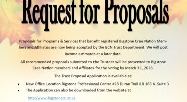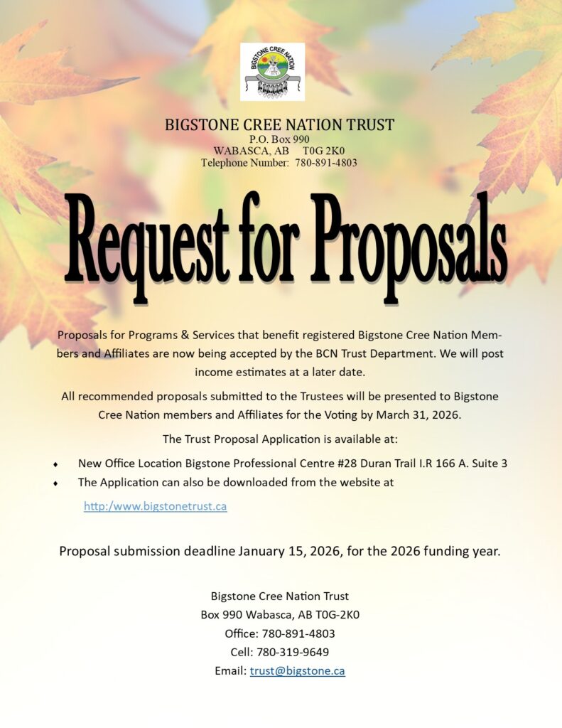 Bigstone Cree Nation Trust is now accepting Trust Proposal Applications for 2026. Contact us at 780-891-4803 or by email at Trust@bigstone.ca to request an application or print